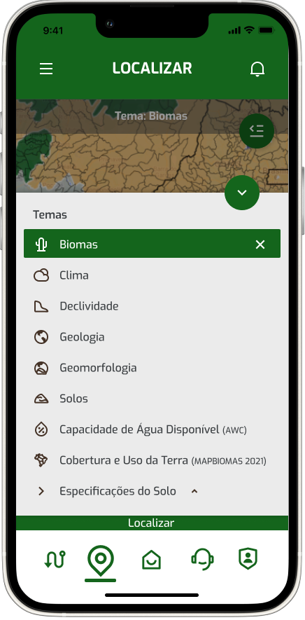 A partir da posição geográfica do seu imóvel, tenha acesso à biomas, geologia, clima, tipos de solos, condutividade elétrica e muito mais.